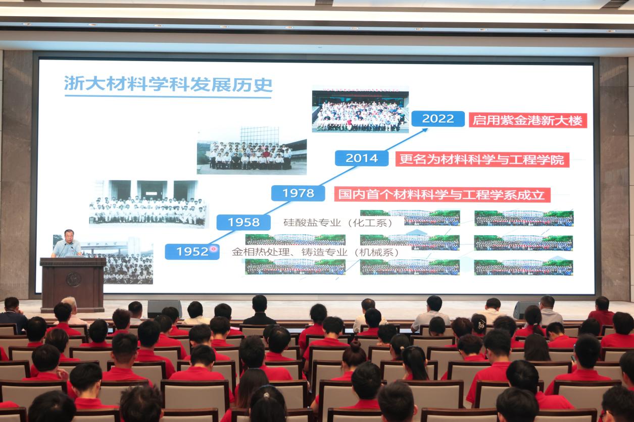 院长朱铁军教授围绕“为什么学材料、怎样学材料、学成之后干什么”展开报告,系统介绍学院发展历程、学科特色与育人成果鼓励同学们夯实专业基础提升学习与沟通能力,成长为有温度、有格局的浙大材料人,同时展望学院在功能材料、AI +材料等前沿领域的布局与发展愿景。
