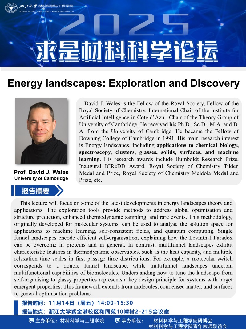 【求是材料科学论坛】2025年10期:关于英国剑桥大学Prof. David J. Wales学术报告会的通知