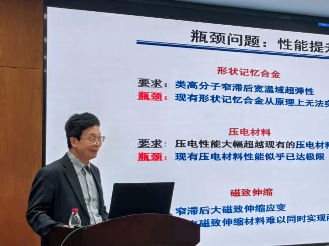 报告伊始,任晓兵教授结合类比了人的大脑感知外界环境驱动向我们介绍了以感知力、电、磁、温度等外场并产生驱动(位移等)的三类铁性智能功能材料:包含铁弹/形状记忆合金,铁电压电材料,铁磁磁致伸缩材料,他们都符合同一Landau物理框架。而如今智能技术的高速发展背景对智能材料性能提出了前所未有的高要求,基于传统原理的性能提升普遍遭遇到原理性瓶颈,亟待发现能够突破当前原理性瓶颈的新原理,进而获得智能材料的性能突破。