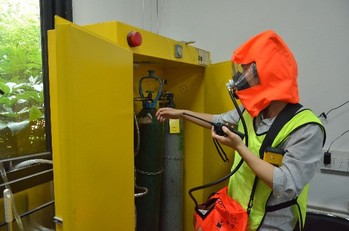 与此同时应急处置小组的两名成员,已在安全技术专家梅工的指导下穿戴好呼吸器具,佩戴好气体监测设备,手持灭火器,在警戒入口处做好信息登记后进入现场进行应急处置。进入后,一名队员排查泄露源迅速关闭气体阀门。另一名队员将门窗打开,确认安全情况后启动了实验室的应急排风。