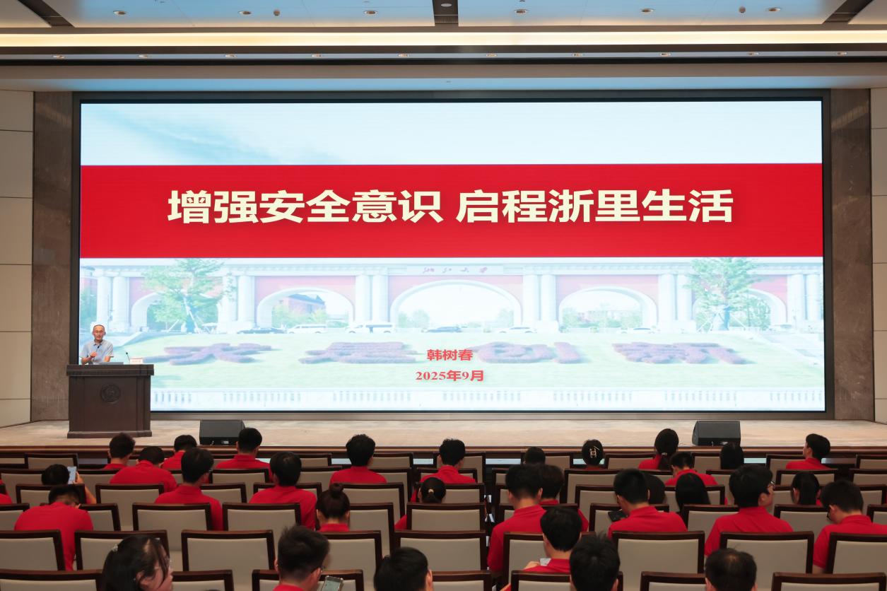 入院仪式第一阶段圆满结束。随后,仪式进入第二阶段议程。浙江大学安保处副处长韩树春以真实案例开篇,为2025级研究生及2024级本科生作专题安全教育报告,围绕消防安全、国家安全、实验室安全三大重点领域,结合校园实际场景详细拆解安全规范,明确风险识别与防范要点,提醒全体新生时刻绷紧安全之弦,让安全意识成为科研学习道路上的坚实保障。