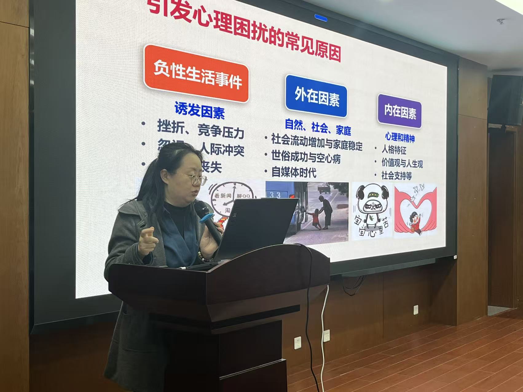 培训伊始,黄芳老师从大学生常见的心理困扰入手,系统讲解了心理健康的基本概念、心理委员的角色定位以及朋辈辅导的基本原则。她结合心理学家Maslow提出的“心理健康十大标准”,引导同学们理解心理健康的多元维度,并详细介绍了常见心理问题的类型与表现,包括学业压力、情绪困扰、人际关系、生涯发展等多方面内容。黄老师还特别强调了心理危机的识别与应对,讲解了发展性危机、境遇性危机、存在性危机与病理性危机的特征与处理原则,帮助心理委员初步建立起心理问题的识别框架与应对意识。
