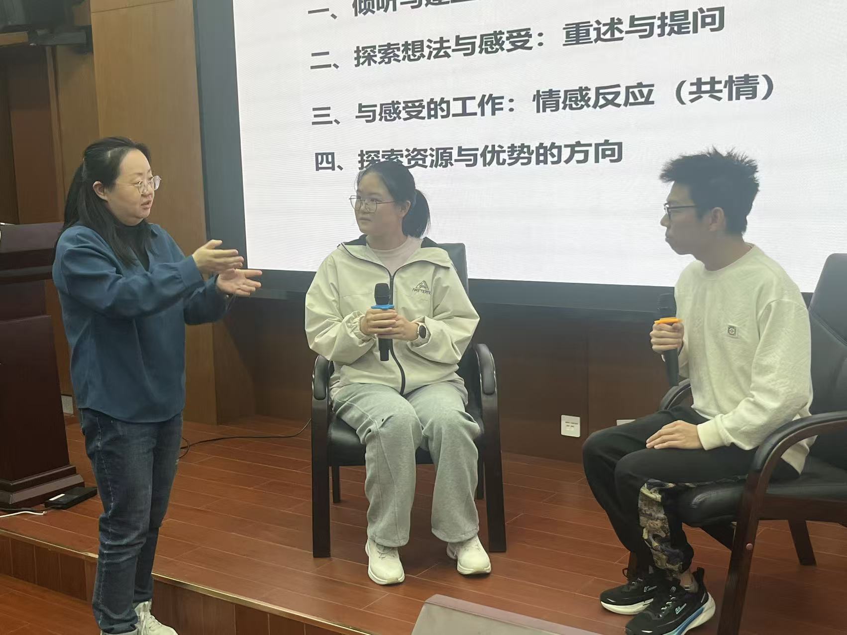 为进一步强化培训效果,黄芳老师邀请两名同学分别扮演“有心理困扰的学生”和“心理委员”,现场演示了一次模拟谈话。通过对谈话过程的细致点评,黄老师指出了沟通中的关键技巧,如积极倾听、开放式提问、情绪反馈、共情表达等,帮助大家直观理解如何在实际交流中建立信任、引导表达、缓解情绪。她强调,“谈话不仅是技术的运用,更是心与心的连接”,鼓励心理委员在陪伴中传递温暖与支持。